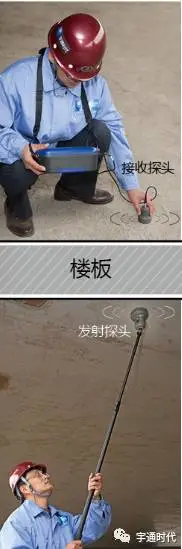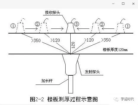 把探头紧贴楼板顶面,在左右慢慢移动探头,使屏幕上厚度值逐渐减小,直到找到最小值的位置,则该位置正好位于发射探头正上方,图2-2中③的位置,显示的厚度值即为该测点的楼板厚度。